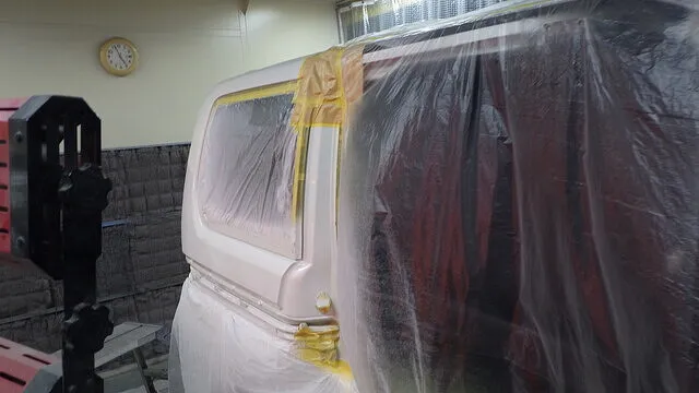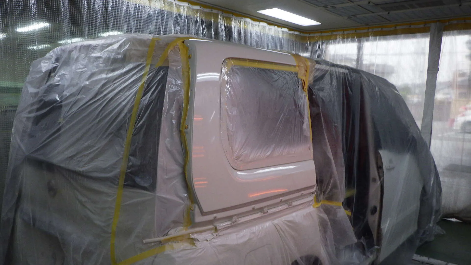 マスキングで周囲を保護し、下地処理→中塗り→上塗り→クリア塗装を経て、焼き付け乾燥機でしっかりと硬化。