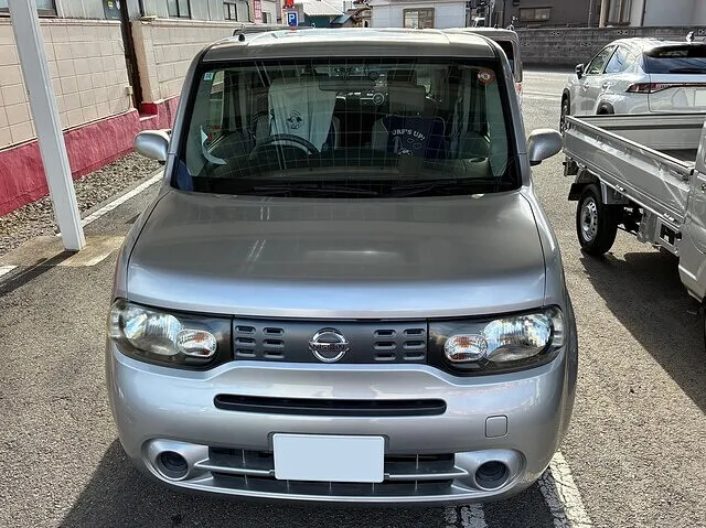 常総市にお住まいのお客様より、日産キューブ(DBA-Z12/H24年式・シルバー)の右リアクォーターパネルのへこみ傷・フロントガラスの飛び石傷の修理依頼をいただきました。