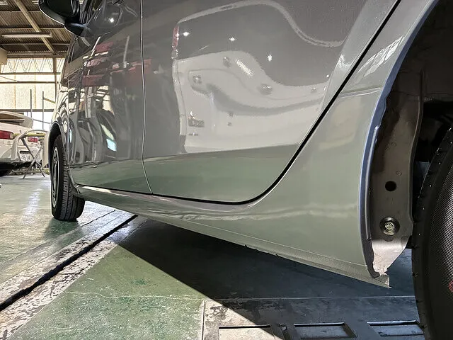 駐車中の接触により、左側リアフェンダーからサイドシル付近にかけて小さなヘコミと擦り傷が発生しており、「できるだけ元通りにしたいけど、費用を抑えて直したい」というご相談でした。
