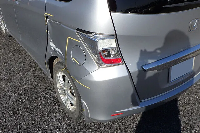 左リア部分を損傷し、特に左リアクォーターのへこみが大きい状態。